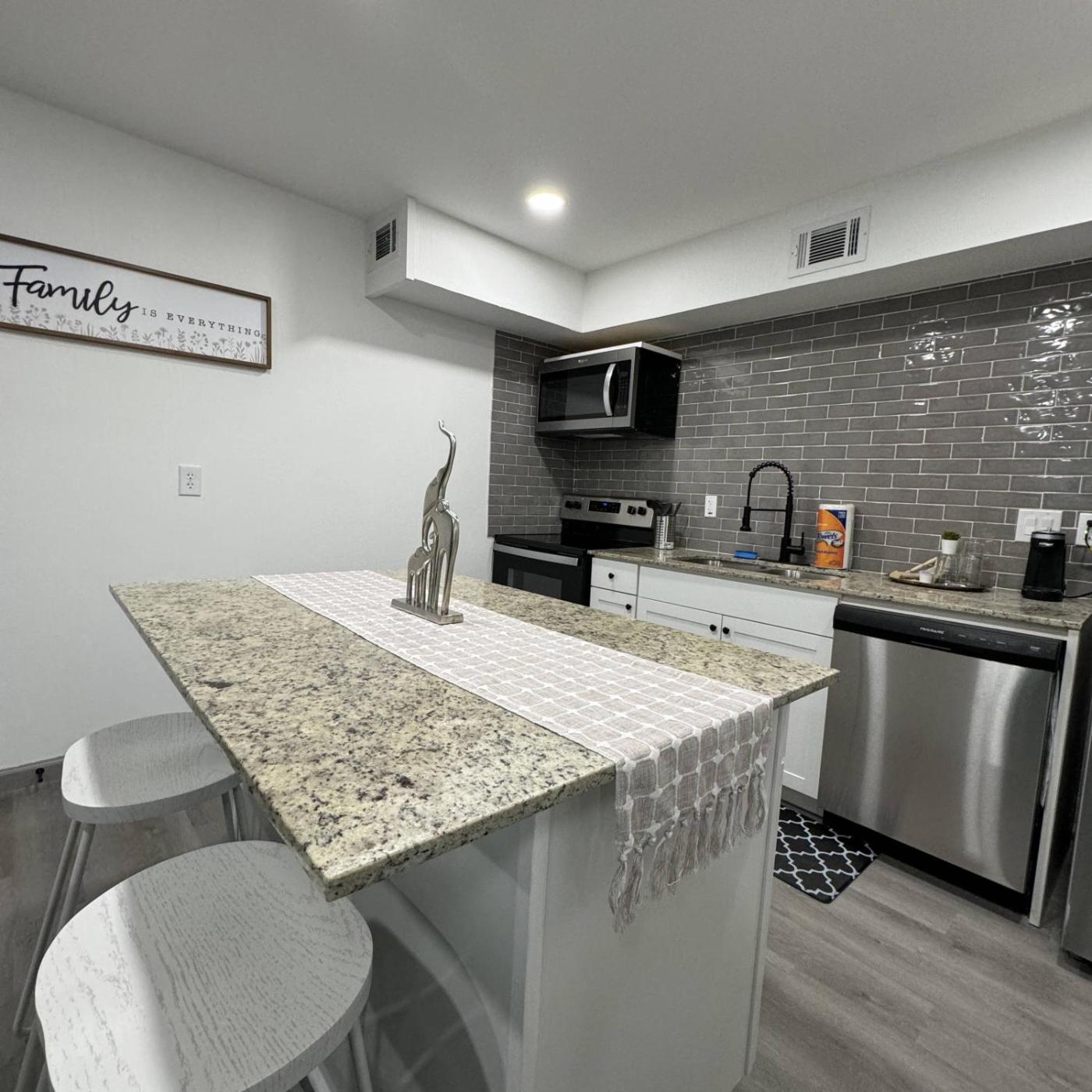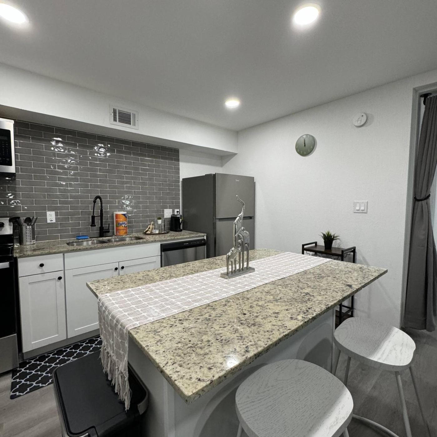 One-Bedroom Apartment. This spacious apartment comes with 1 bedroom, a kitchen and 1 bathroom with a shower. Guests can make meals in the kitchen that features a stovetop, a refrigerator, a dishwasher and kitchenware. The apartment features air conditioning, a washing machine, a dining area, a sofa and a flat-screen TV. The unit has 1 bed.