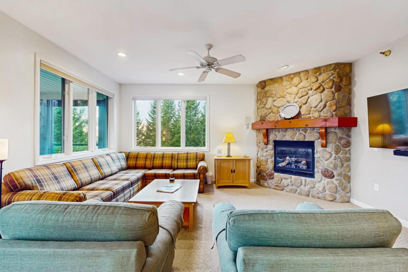 Three Bedroom Apartment. The fireplace is the standout feature of this apartment. Boasting a private entrance, this air-conditioned apartment comes with 1 living room, 3 separate bedrooms and 2 bathrooms with a walk-in shower and a bath. Guests will find a stovetop, a refrigerator, a dishwasher and kitchenware in the kitchen. The apartment also includes a barbecue. The spacious apartment features a TV with cable channels, a washing machine, a tea and coffee maker, a seating area as well as mountain views. The unit has 7 beds.